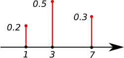 Figure 4: The probability mass function of a discrete probability distribution. The probabilities of the singletons {1}, {3}, and {7} are respectively 0.2, 0.5, 0.3. A set not containing any of these points has probability zero.
