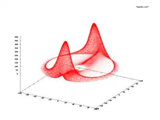 One example is shown in the figure to the right, which displays the evolution of a system of differential equations (commonly known as the Rabinovich–Fabrikant equations) that can be used to model the behaviour of Langmuir waves in plasma.[26] When this phenomenon is studied, the observed states from the subset are as indicated in red. So one could ask what is the probability of observing a state in a certain position of the red subset; if such a probability exists, it is called the probability measure of the system.[27][25]