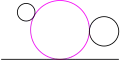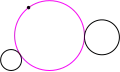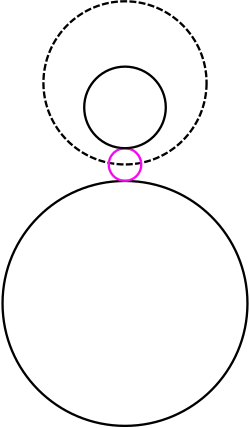 The solution circle may be either internally or externally tangent to each of the given circles. An external tangency is one where the two circles bend away from each other at their point of contact; they lie on opposite sides of the tangent line at that point, and they exclude one another. The distance between their centers equals the sum of their radii. By contrast, an internal tangency is one in which the two circles curve in the same way at their point of contact; the two circles lie on the same side of the tangent line, and one circle encloses the other. In this case, the distance between their centers equals the difference of their radii. As an illustration, in Figure 1, the pink solution circle is internally tangent to the medium-sized given black circle on the right, whereas it is externally tangent to the smallest and largest given circles on the left.