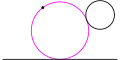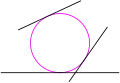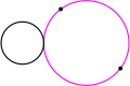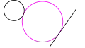 The property of tangency is defined as follows. First, a point, line or circle is assumed to be tangent to itself; hence, if a given circle is already tangent to the other two given objects, it is counted as a solution to Apollonius' problem. Two distinct geometrical objects are said to intersect if they have a point in common. By definition, a point is tangent to a circle or a line if it intersects them, that is, if it lies on them; thus, two distinct points cannot be tangent. If the angle between lines or circles at an intersection point is zero, they are said to be tangent; the intersection point is called a tangent point or a point of tangency. (The word "tangent" derives from the Latin present participle, tangens, meaning "touching".) In practice, two distinct circles are tangent if they intersect at only one point; if they intersect at zero or two points, they are not tangent. The same holds true for a line and a circle. Two distinct lines cannot be tangent in the plane, although two parallel lines can be considered as tangent at a point at infinity in inversive geometry (see below).[5][6]