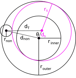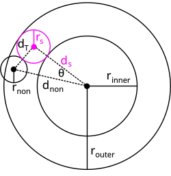 When two of the given circles are concentric, Apollonius's problem can be solved easily using a method of Gauss.[28] The radii of the three given circles are known, as is the distance dnon from the common concentric center to the non-concentric circle (Figure 7). The solution circle can be determined from its radius rs, the angle θ, and the distances ds and dT from its center to the common concentric center and the center of the non-concentric circle, respectively. The radius and distance ds are known (Figure 7), and the distance dT = rs ± rnon, depending on whether the solution circle is internally or externally tangent to the non-concentric circle. Therefore, by the law of cosines,