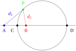 The general statement of Apollonius' problem is to construct one or more circles that are tangent to three given objects in a plane, where an object may be a line, a point or a circle of any size.[1][2][3][4] These objects may be arranged in any way and may cross one another; however, they are usually taken to be distinct, meaning that they do not coincide. Solutions to Apollonius' problem are sometimes called Apollonius circles, although the term is also used for other types of circles associated with Apollonius.