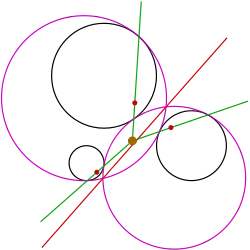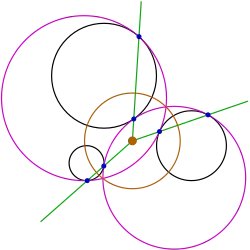 In general, any three distinct circles have a unique circle—the radical circle—that intersects all of them perpendicularly; the center of that circle is the radical center of the three circles.[4] For illustration, the orange circle in Figure 6 crosses the black given circles at right angles. Inversion in the radical circle leaves the given circles unchanged, but transforms the two conjugate pink solution circles into one another. Under the same inversion, the corresponding points of tangency of the two solution circles are transformed into one another; for illustration, in Figure 6, the two blue points lying on each green line are transformed into one another. Hence, the lines connecting these conjugate tangent points are invariant under the inversion; therefore, they must pass through the center of inversion, which is the radical center (green lines intersecting at the orange dot in Figure 6).