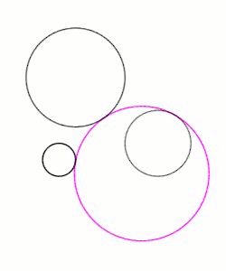 The usefulness of inversion can be increased significantly by resizing.[37][38] As noted in Viète's reconstruction, the three given circles and the solution circle can be resized in tandem while preserving their tangencies. Thus, the initial Apollonius problem is transformed into another problem that may be easier to solve. For example, the four circles can be resized so that one given circle is shrunk to a point; alternatively, two given circles can often be resized so that they are tangent to one another. Thirdly, given circles that intersect can be resized so that they become non-intersecting, after which the method for inverting to an annulus can be applied. In all such cases, the solution of the original Apollonius problem is obtained from the solution of the transformed problem by undoing the resizing and inversion.