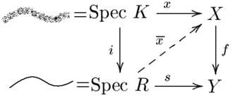 with a lifting of . Geometrically this means every curve in the scheme can be completed to a compact curve. This bit of intuition aligns with what the scheme-theoretic interpretation of a morphism of topological spaces with compact fibers, that a sequence in one of the fibers must converge. Because this geometric situation is a problem locally, the diagram is replaced by looking at the local ring , which is a DVR, and its fraction field . Then, the lifting problem then gives the commutative diagram