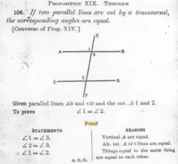 A particular way of organising a proof using two parallel columns is often used as a mathematical exercise in elementary geometry classes in the United States.[29] The proof is written as a series of lines in two columns. In each line, the left-hand column contains a proposition, while the right-hand column contains a brief explanation of how the corresponding proposition in the left-hand column is either an axiom, a hypothesis, or can be logically derived from previous propositions. The left-hand column is typically headed "Statements" and the right-hand column is typically headed "Reasons".[30]