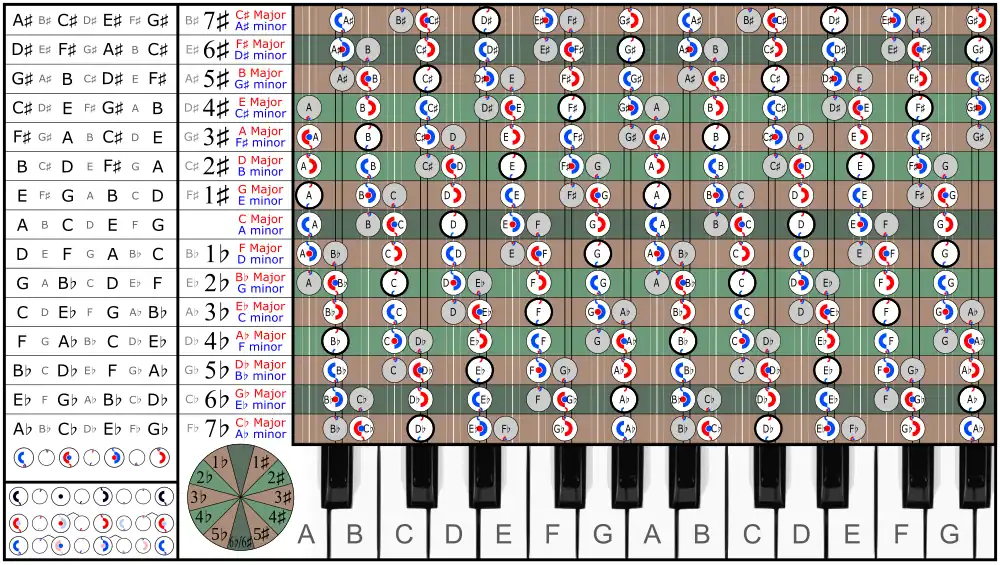 In the following table of musical scales in the circle of fifths, the Pythagorean comma is visible as the small interval between, e.g., F♯ and G♭. Going around the circle of fifths with just intervals results in a comma pump by the Pythagorean comma.