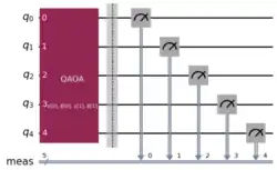 The quantum circuit shown here is from a simple example of how the QAOA algorithm can be implemented in Python[23] using Qiskit, an open-source quantum computing software development framework by IBM.