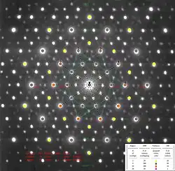 A quasiperiodic crystal, or quasicrystal, is a structure that is ordered but not periodic. A quasicrystalline pattern can continuously fill all available space, but it lacks translational symmetry.[2] While crystals, according to the classical crystallographic restriction theorem, can possess only two-, three-, four-, and six-fold rotational symmetries, the Bragg diffraction pattern of quasicrystals shows sharp peaks with other symmetry orders—for instance, five-fold.[3]