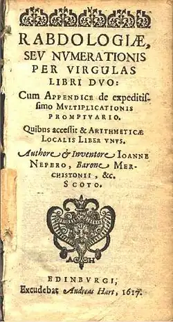 In 1617 a treatise in Latin titled Rabdologiæ and written by John Napier was published in Edinburgh. Printed three years after his treatise on the discovery of logarithms and in the same year as his death, it describes three devices to aid arithmetic calculations.