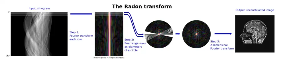 Explicit and computationally efficient inversion formulas for the Radon transform and its dual are available. The Radon transform in dimensions can be inverted by the formula:[11] where , and the power of the Laplacian is defined as a pseudo-differential operator if necessary by the Fourier transform: For computational purposes, the power of the Laplacian is commuted with the dual transform to give:[12] where is the Hilbert transform with respect to the s variable. In two dimensions, the operator appears in image processing as a ramp filter.[13] One can prove directly from the Fourier slice theorem and change of variables for integration that for a compactly supported continuous function of two variables: Thus in an image processing context the original image can be recovered from the 'sinogram' data by applying a ramp filter (in the variable) and then back-projecting. As the filtering step can be performed efficiently (for example using digital signal processing techniques) and the back projection step is simply an accumulation of values in the pixels of the image, this results in a highly efficient, and hence widely used, algorithm.