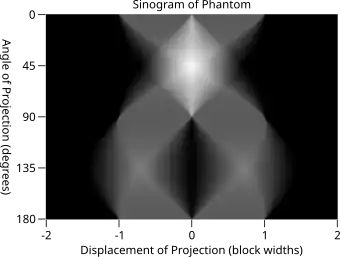 The Radon transform data is often called a sinogram because the Radon transform of an off-center point source is a sinusoid. Consequently, the Radon transform of a number of small objects appears graphically as a number of blurred sine waves with different amplitudes and phases.