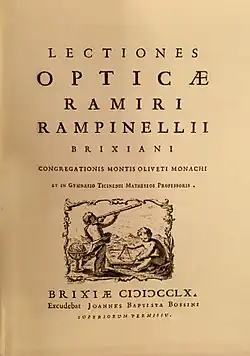 In 1758 his Lectiones opticæ Ramiri Rampinelii brixiani Congregationis Montis Oliveti monachi et in gymnasio Ticinensi Matheseos Professoris was published with the prestigious Brescia printer Bossini.[1] This work on optics was to have been followed by Trigonometria and Applicazione dei principi matematici alla fisica pratica, but Rampinelli suffered a stroke on 10 April 1758.[7]