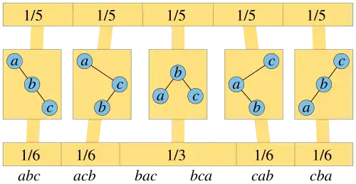For instance, if the three keys 1,3,2 are inserted into a binary search tree in that sequence, the number 1 will sit at the root of the tree, the number 3 will be placed as its right child, and the number 2 as the left child of the number 3. There are six different permutations of the keys 1,2, and 3, but only five trees may be constructed from them. That is because the permutations 2,1,3 and 2,3,1 form the same tree. Thus, this tree has probability of being generated, whereas the other four trees each have probability .[5]