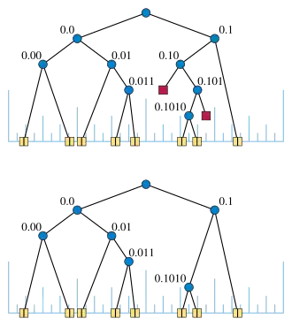 A variant of the trie, the radix tree or compressed trie, eliminates empty external nodes and their parent internal nodes. The remaining internal nodes correspond to prefixes for which both possible extensions, by a zero or a one bit, are used by at least one of the randomly chosen numbers. For a radix tree for uniformly distributed binary numbers, the shortest leaf-root path has length and the longest leaf-root path has length both with high probability.[34]