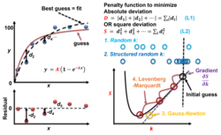 - Friedman-Savage procedure: Sequentially search each parameter with a set of guesses that have a space pattern between the initial guess and the boundaries.[5] An example of exponentially distributed steps can be found here in a MATLAB code (JCFit @ GitHub).[2] This example code converges 1-2 orders of magnitude slower than the Levenberg–Marquardt algorithm, with an example also provided in the GitHub.