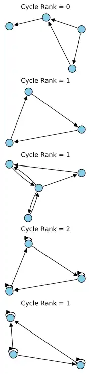 The fourth has cycle rank 2; it is strongly connected, and it takes the removal of 1 vertex to make it not so. After that, each strongly connected component remaining has cycle rank 1, so the 1 vertex removed initially plus the max rank among the components. The fifth looks similar to the fourth, but since it is not strongly connected, and the maximum cycle rank of its components is 1, it has the same cycle rank as the second and third graphs.