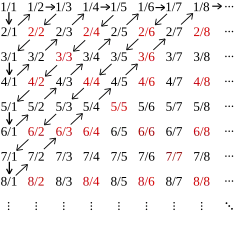 More precisely, one can sort the fractions by increasing values of the sum of the numerator and the denominator, and, for equal sums, by increasing numerator or denominator. This produces a sequence of fractions, from which one can remove the reducible fractions (in red on the figure), for getting a sequence that contains each rational number exactly once. This establishes a bijection between the rational numbers and the natural numbers, which maps each rational number to its rank in the sequence.