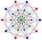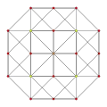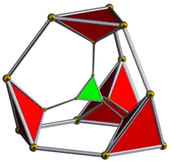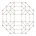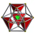 Tetrahedron-centered perspective projection into 3D space, with nearest tetrahedron to the 4D viewpoint rendered in red, and the 4 surrounding octahedra in green. Cells lying on the far side of the polytope have been culled for clarity (although they can be discerned from the edge outlines). The rotation is only of the 3D projection image, in order to show its structure, not a rotation in 4D space. |
