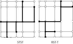 A number of algorithms exist which start from the rectilinear minimum spanning tree (RMST; the minimum spanning tree in the plane with rectilinear distance) and try to decrease its length by introducing Steiner points. The RMST itself may be up to 1.5 times longer than MRST.[6]