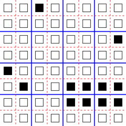 A block cellular automaton is an automaton at which, in each time step, the cells of the automaton are partitioned into congruent subsets (called blocks), and the same transformation is applied independently to each block. Typically, such an automaton will use more than one partition into blocks, and will rotate between these partitions at different time steps of the system.[10] In a frequently used form of this design, called the Margolus neighborhood, the cells of the automaton form a square grid and are partitioned into larger 2 × 2 square blocks at each step. The center of a block at one time step becomes the corner of four blocks at the next time step, and vice versa; in this way, the four cells in each 2 × 2 belong to four different 2 × 2 squares of the previous partition.[11] The Critters rule discussed above is an example of this type of automaton.