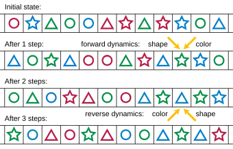 A cellular automaton is defined by its cells (often a one- or two-dimensional array), a finite set of values or states that can go into each cell, a neighborhood associating each cell with a finite set of nearby cells, and an update rule according to which the values of all cells are updated, simultaneously, as a function of the values of their neighboring cells. The simplest possible cellular automata have a one-dimensional array of cells, each of which can hold a binary value (either 0 or 1), with each cell having a neighborhood consisting only of it and its two nearest cells on either side; these are called the elementary cellular automata.[2] If the update rule for such an automaton causes each cell to always remain in the same state, then the automaton is reversible: the previous state of all cells can be recovered from their current states, because for each cell the previous and current states are the same. Similarly, if the update rule causes every cell to change its state from 0 to 1 and vice versa, or if it causes a cell to copy the state from a fixed neighboring cell, or if it causes it to copy a state and then reverse its value, it is necessarily reversible.[3] Toffoli & Margolus (1990) call these types of reversible cellular automata, in which the state of each cell depends only on the previous state of one neighboring cell, "trivial". Despite its simplicity, the update rule that causes each cell to copy the state of a neighboring cell is important in the theory of symbolic dynamics, where it is known as the shift map.[4]