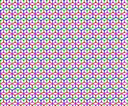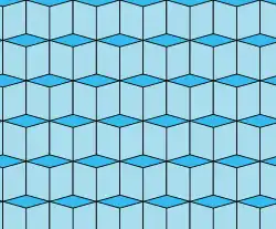 In geometry, the rhombille tiling,[1] also known as tumbling blocks,[2] reversible cubes, or the dice lattice, is a tessellation of identical 60° rhombi on the Euclidean plane. Each rhombus has two 60° and two 120° angles; rhombi with this shape are sometimes also called diamonds. Sets of three rhombi meet at their 120° angles, and sets of six rhombi meet at their 60° angles.