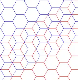 The rhombille tiling overlaid on its dual, the trihexagonal tiling.