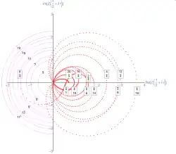 Riemann zeta function along the critical line with Re(s) = 1/2. Real values are shown on the horizontal axis and imaginary values are on the vertical axis. Re(ζ(1/2 + it)), Im(ζ(1/2 + it)) is plotted with t ranging between −30 and 30.[3]- Animation showing in 3D the Riemann zeta function critical strip (blue, where s has real part between 0 and 1), critical line (red, for real part of s equals 0.5) and zeroes (cross between red and orange): [x,y,z] = [Re(ζ(r + it)), Im(ζ(r + it)), t] with 0.1 ≤ r ≤ 0.9 and 1 ≤ t ≤ 51