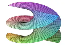 The hyperboloid on two sheets {(x, y, z) : z2 = 1 + x2 + y2} is a regular surface; it can be covered by two Monge patches, with h(u, v) = ±(1 + u2 + v2)1/2. The helicoid appears in the theory of minimal surfaces. It is covered by a single local parametrization, f(u, v) = (u sin v, u cos v, v).
