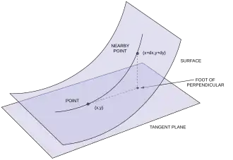 | Implicit functions | ... for any local defining function F whose domain contains p, X is orthogonal to ∇F(p) | ... for any local defining function F whose domain contains p, n is a multiple of ∇F(p) |