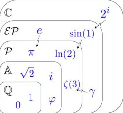 The following numbers are among the ones known to be periods:[1][2][4][7]