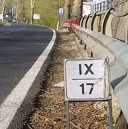 There are numerous historical examples of IIX being used for 8; for example, XIIX was used by officers of the XVIII Roman Legion to write their number.[24][25] The notation appears prominently on the cenotaph of their senior centurion Marcus Caelius (c. 45 BC – 9 AD). On the publicly displayed official Roman calendars known as Fasti, XIIX is used for the 18 days to the next Kalends, and XXIIX for the 28 days in February. The latter can be seen on the sole extant pre-Julian calendar, the Fasti Antiates Maiores.[26] There are historical examples of other subtractive forms: IIIXX for 17,[27] IIXX for 18,[28] IIIC for 97,[29] IIC for 98,[30][31] and IC for 99.[32] A possible explanation is that the word for 18 in Latin is duodeviginti— literally "two from twenty"— while 98 is duodecentum (two from hundred) and 99 is undecentum (one from hundred).[33] However, the explanation does not seem to apply to IIIXX and IIIC, since the Latin words for 17 and 97 were septendecim (seven ten) and nonaginta septem (ninety seven), respectively.