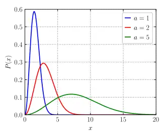 This probability density function gives the probability, per unit speed, of finding the particle with a speed near v. This equation is simply the Maxwell–Boltzmann distribution (given in the infobox) with distribution parameter The Maxwell–Boltzmann distribution is equivalent to the chi distribution with three degrees of freedom and scale parameter