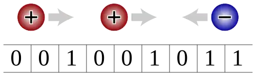 This process can be modeled by Rule 184, as follows. The particles are modeled as points that are aligned, not with the cells of the automaton, but rather with the interstices between cells. Two consecutive cells that both have state 0 model a particle at the space between these two cells that moves rightwards one cell at each time step. Symmetrically, two consecutive cells that both have state 1 model an antiparticle that moves leftwards one cell at each time step. The remaining possibilities for two consecutive cells are that they both have differing states; this is interpreted as modeling a background material without any particles in it, through which the particles move. With this interpretation, the particles and antiparticles interact by ballistic annihilation: when a rightwards-moving particle and a leftwards-moving antiparticle meet, the result is a region of background from which both particles have vanished, without any effect on any other nearby particles.[22]