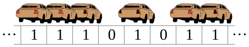 - ↑ For the definition of this code, see Wolfram (2002), p.53. For the calculation of this code for Rule 184, see e.g. Boccara & Fukś (1998).