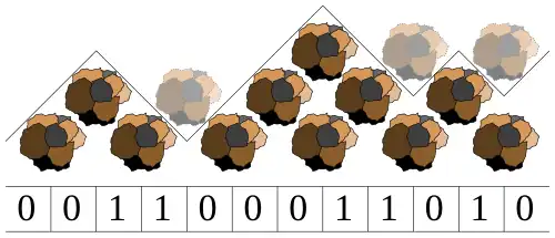 To model this process by Rule 184, observe that the boundary between filled and unfilled lattice positions can be marked by a polygonal line, the segments of which separate adjacent lattice positions and have slopes +1 and −1. Model a segment with slope +1 by an automaton cell with state 0, and a segment with slope −1 by an automaton cell with state 1. The local minima of the surface are the points where a segment of slope −1 lies to the left of a segment of slope +1; that is, in the automaton, a position where a cell with state 1 lies to the left of a cell with state 0. Adding a particle to that position corresponds to changing the states of these two adjacent cells from 1,0 to 0,1, so advancing the polygonal line. This is exactly the behavior of Rule 184.[19]
