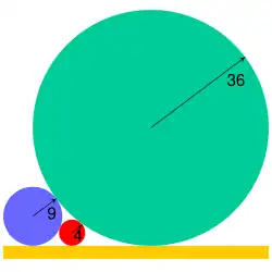 • A typical problem, which is presented on an 1824 tablet in Gunma Prefecture, covers the relationship of three touching circles with a common tangent, a special case of Descartes' theorem. Given the size of the two outer large circles, what is the size of the small circle between them? The answer is: