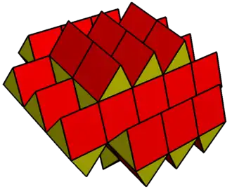 In geometry, the gyrobifastigium is a polyhedron that is constructed by attaching a triangular prism to square face of another one. It is an example of a Johnson solid. It is the only Johnson solid that can tile three-dimensional space.[1][2]