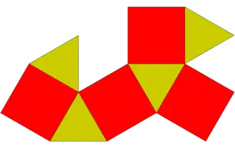 The gyrobifastigium can be constructed by attaching two triangular prisms along corresponding square faces, giving a quarter-turn to one prism.[3] These prisms cover the square faces so the resulting polyhedron has four equilateral triangles and four squares, making eight faces in total, an octahedron.[4] Because its faces are all regular polygons and it is convex, the gyrobifastigium is a Johnson solid, indexed as .[5]