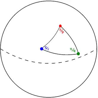 A fundamental domain triangle (p q r), with vertex angles π⁄p, π⁄q, and π⁄r, can exist in different spaces depending on the value of the sum of the reciprocals of these integers: