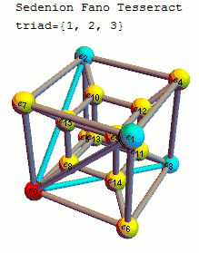 The particular sedenion multiplication table shown above is represented by 35 triads. The table and its triads have been constructed from an octonion represented by the bolded set of 7 triads using Cayley–Dickson construction. It is one of 480 possible sets of 7 triads (one of two shown in the octonion article) and is the one based on the Cayley–Dickson construction of quaternions from two possible quaternion constructions from the complex numbers. The binary representations of the indices of these triples bitwise XOR to 0. These 35 triads are: