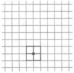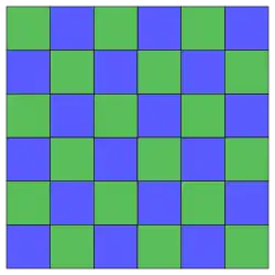 A tiling can also be self-dual. The square tiling, with Schläfli symbol {4,4}, is self-dual; shown here are two square tilings (red and black), dual to each other.