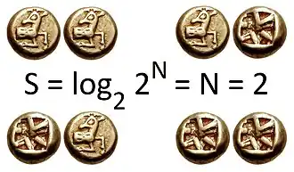 In information theory, the entropy of a random variable quantifies the average level of uncertainty or information associated with the variable's potential states or possible outcomes. This measures the expected amount of information needed to describe the state of the variable, considering the distribution of probabilities across all potential states. Given a discrete random variable , which may be any member within the set and is distributed according to , the entropy is where denotes the sum over the variable's possible values.[Note 1] The choice of base for , the logarithm, varies for different applications. Base 2 gives the unit of bits (or "shannons"), while base e gives "natural units" nat, and base 10 gives units of "dits", "bans", or "hartleys". An equivalent definition of entropy is the expected value of the self-information of a variable.[1]