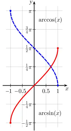 The inverse function of sine is arcsine or inverse sine, denoted as "arcsin", "asin", or .[23] The inverse function of cosine is arccosine, denoted as "arccos", "acos", or .[a] As sine and cosine are not injective, their inverses are not exact inverse functions, but partial inverse functions. For example, , but also , , and so on. It follows that the arcsine function is multivalued: , but also , , and so on. When only one value is desired, the function may be restricted to its principal branch. With this restriction, for each in the domain, the expression will evaluate only to a single value, called its principal value. The standard range of principal values for arcsin is from to , and the standard range for arccos is from to .[24]