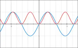 The cosine double angle formula implies that sin2 and cos2 are, themselves, shifted and scaled sine waves. Specifically,[27] The graph shows both sine and sine squared functions, with the sine in blue and the sine squared in red. Both graphs have the same shape but with different ranges of values and different periods. Sine squared has only positive values, but twice the number of periods.