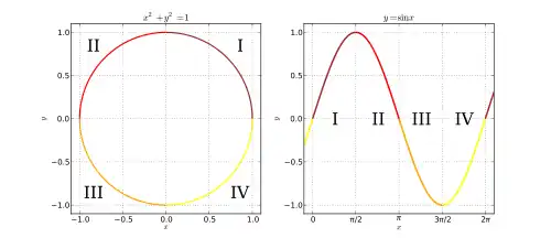The sine and cosine functions are infinitely differentiable.[15] The derivative of sine is cosine, and the derivative of cosine is negative sine:[16] Continuing the process in higher-order derivative results in the repeated same functions; the fourth derivative of a sine is the sine itself.[15] These derivatives can be applied to the first derivative test, according to which the monotonicity of a function can be defined as the inequality of function's first derivative greater or less than equal to zero.[17] It can also be applied to second derivative test, according to which the concavity of a function can be defined by applying the inequality of the function's second derivative greater or less than equal to zero.[18] The following table shows that both sine and cosine functions have concavity and monotonicity—the positive sign () denotes a graph is increasing (going upward) and the negative sign () is decreasing (going downward)—in certain intervals.[19] This information can be represented as a Cartesian coordinates system divided into four quadrants.