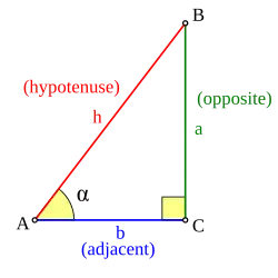 Once such a triangle is chosen, the sine of the angle is equal to the length of the opposite side divided by the length of the hypotenuse, and the cosine of the angle is equal to the length of the adjacent side divided by the length of the hypotenuse:[1]