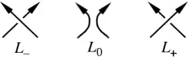 The three diagrams are labelled as follows. Turn the three link diagram so the directions at the crossing in question are both roughly northward. One diagram will have northwest over northeast, it is labelled L−. Another will have northeast over northwest, it's L+. The remaining diagram is lacking that crossing and is labelled L0.