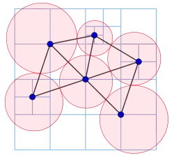 As Keszegh, Pach & Pálvölgyi (2011) showed, every planar graph has a planar straight-line drawing in which the number of distinct slopes is a function of the degree of the graph. Their proof follows a construction of Malitz & Papakostas (1994) for bounding the angular resolution of planar graphs as a function of degree, by completing the graph to a maximal planar graph without increasing its degree by more than a constant factor, and applying the circle packing theorem to represent this augmented graph as a collection of tangent circles. If the degree of the initial graph is bounded, the ratio between the radii of adjacent circles in the packing will also be bounded by the ring lemma,[5] which in turn implies that using a quadtree to place each graph vertex on a point within its circle will produce slopes that are ratios of small integers. The number of distinct slopes produced by this construction is exponential in the degree of the graph.
